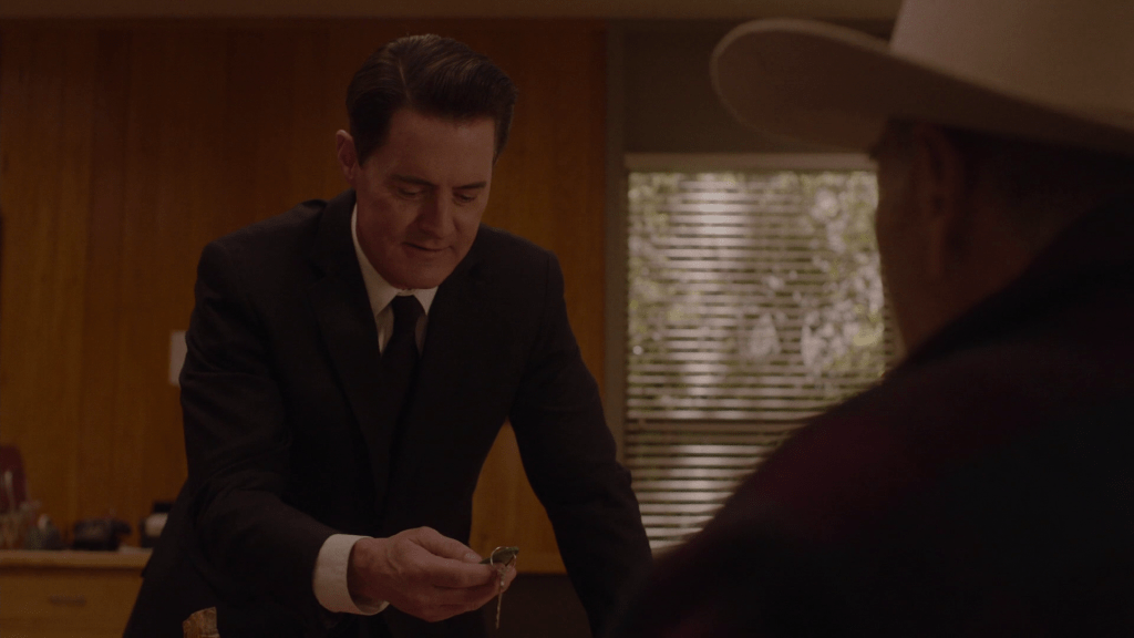 到目前为止,一切都还是熟悉的。然后,在全新的开场片段后(此时我们一睹红房间的新质感),在黑白影像中,一个优雅又有些许不稳定的镜头抬升,我们看到Fireman,对面坐着库珀。虽然影像风格上,这个段落显然已和原版剧集划开了界限,此时此刻我们仍然可以说这是熟悉的,毕竟谁不会想看到如此经典角色的回归呢?紧接着这一段落的,是森林中的杰科比医生的回归。为什么是他?我们问自己。况且,这不是你所熟悉的介绍回归人物的方式,镜头设计完全是疏离的,没有任何特写,没有标志性的音乐,我们甚至也不太明白他订购这些铲子的目的是如何。整个段落在真实时间中以写实的美学展开,在远处静悄悄地观察着这个人物,结尾处摄影机在树根后面的注视更略有一种监控视角的意味。不过就算如此,我们在双峰镇,我们在熟悉的森林里看到了熟悉的人物,即便没有故事展开,一切还是安抚人心的,于是我们放下了警惕。然而……
