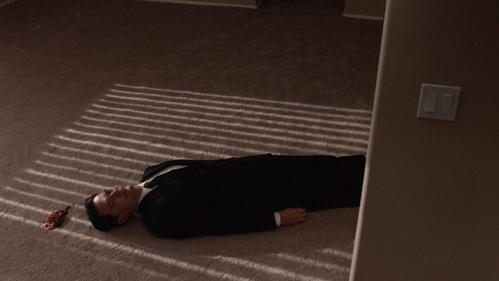 道奇·琼斯,一个多么平凡的名字:“道奇”像是那种人们用来称呼家养小狗的昵称,而“琼斯”则是大卫·鲍伊(本名大卫·罗伯特·琼斯)出道时选择抛弃的那个毫无特点的姓氏。显然,他不拥有库珀所拥有的一切气质:衣品极差(即便林奇拍出了怪异的美感),头上显然戴着假发,大腹便便地躺在空房子简陋的床垫上。这是库珀能成为的最差的样子,甚至更不济于坏库珀,后者最起码还有些大反派的魅力飘荡在其中,而道奇只能懒散地从脸上挤出几点笑容来,比任何的超现实效果都更加荒唐。但就在我们还在好奇此君究竟为何物时,他便消失了(第三集),被真正的库珀取代,后者陷入了一种半梦半醒的状态——就当我们觉得事情无法更糟时,我们不得不眼睁睁看着曾经威武的《双峰》男一号变成了一个彻头彻尾的傻子,还被困在了一个更糟的身份中:幸运7号(Lucky 7 Insurance)保险公司职位摇摇欲坠的推销员,被犯罪团伙追杀,被要挟在赌债中,还因为出轨被妻子嫌弃。