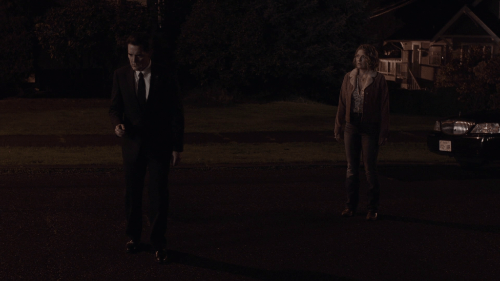 随后,夜幕降临,就连双R餐厅也灯火熄灭。每当面临第十八集,我总是感到深深的词穷,我的眼睛的一部分永远被封印于2017年9月3日。能说什么呢?我看到这个男人,即便被时间抛弃,身份被剥夺,仍然坚信自己是“FBI”:在“朱迪”餐厅他这么宣布到;在Carrie Page的家门口他再次这么宣布;当被怀疑时,他掏出那枚徽章;最终,在曾属于帕尔默的房子前,他最后一次说出:“联邦调查局,我是特别探员戴尔·库珀。” 但此时,面对门对面的陌生人(该栋房子的真实屋主),就连他也开始怀疑——凯尔用一个微妙的提问语气说出这句台词。但我们又能指望他做什么别的呢?凯尔·麦克拉克伦和雪莉·李,这两位《双峰》绝对的灵魂,在此时站在这个房子面前,一切注定如此,又不应如此:这个夜晚,在这空无一人的小路中央——三年后的我们将在现实中看到如此的景象。在双峰警局难忘的重逢后,如果库珀选择和这群宝贵的人们在一起,而没有与戴安和戈登一起被那黑暗吞噬的话,又会发生什么?我们或许永远不会知道。但请让我现在给大家留下这些: