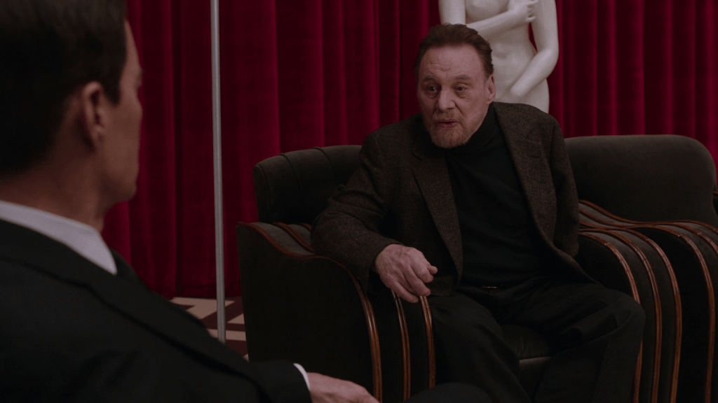 虽然我们都了解成就《双峰》的并不都在于它的故事情节,但那些关于它的种种感官体验:梦幻般的小镇气氛、极佳的音乐、魅力十足又古怪的演员们等等,或许暂不应被文字化,因此我还是从叙事开始。首先,需要指出一些反常的地方。在回归季中,包括Fireman与库珀揭幕的第一场戏在内,总是有着大量如下的情节——线索被角色全盘托出,摄影机静静地看着,有时反打拍摄其他人的反应,总之,一段段长段的解释。这时人们会怀疑:这还是我们熟悉的“视听艺术家”林奇吗?为何突然一反常态地开始解释各种元素,这是一种惰性还是对电影语言的背离?
