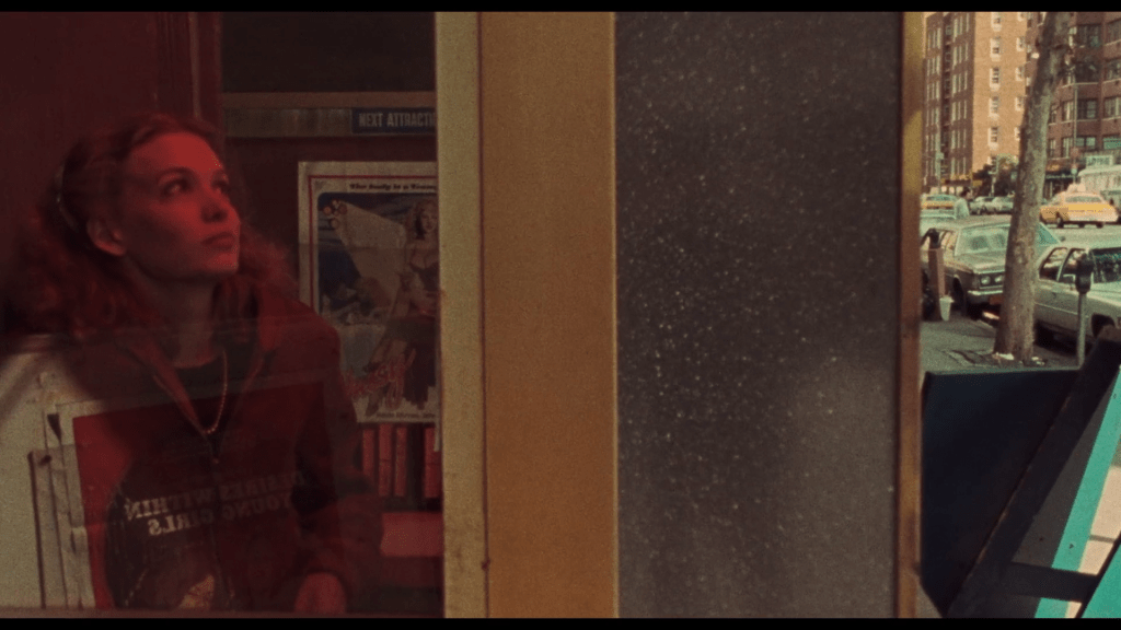 I was intrigued by the film immediately. The DVD copy didn’t exactly have the best image quality. At daylight, it brings the mundane a touch of haziness; at night, or dark spaces, a porno theater, a bar where photographer Nan Goldin bartended, the negative space that consumed in black and shadow shed each frame into something that could only be described as almost-mythical sensations. New York City of the 1980s bloomed in its trashy glory. Two months after my initial viewing, the Quad Cinema at 13th street hosted Gordon with the premiere of a new restoration. The image and sound were dazzling in its restored condition, with a memorable Q&A afterward. I didn’t remember the exact words of Gordon, but I remember the energy this radical filmmaker had brought, speaking like the provocateur she is. Of course, Variety theater no longer exists, but oddly, the space felt at home to me, for there’s serenity in Gordon’s images, which introduce the idea of a woman quietly subverting a place traditionally “for men.” This serenity then is synonymous with a true spirit of independence; it has a presence even when the film was at its most upsetting, namely, a series of erotic monologues from Christine. Unlike the on-screen boyfriend, we are totally at ease with the presence of Sandy McLeod, in the condensed space of a ticket booth, in the lobby of the dirty movie palace, in her tiny apartment, and soon we will follow her to all other places.