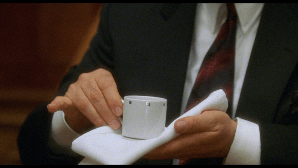 As it was in the beginning, this dream in Mulholland Drive is not always a fairytale, but it’s always funny, that’s where the coffee scene comes in. A young filmmaker, Adam Kesher, is recasting his lead actress after a woman’s disappearance, and we suspect that this woman is indeed the disappeared Rita whom we know from the film’s “other” plot. In a room of claustrophobic quality, with its wooden and narrow decor, the filmmaker is surrounded by his agent, two studio executives, and two Italian producers slash mobster-archetype. The atmosphere is that of a police interrogation (or worse), but the audience’s attention is almost immediately shifted to a seemingly minor detail: the Italian (Angelo Badalamenti, Lynch’s longtime composer) and his high standard for espressos. This side quest hijacks the scene’s main plot, which goes nowhere at the moment – the director bluntly refuses the appointed actress. For a minute, all eyes are on the coffee, in its tiny espresso cup, hand-delivered by a bulky waiter. The feeling is ominous, but still with clarity: Badalamenti is not gonna like it.