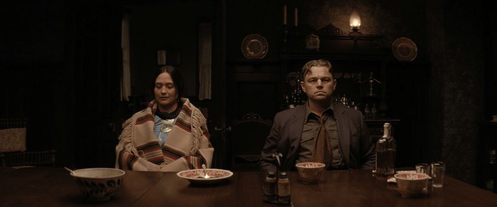 作为影片最核心的矛盾,厄尼斯特和莫莉的爱情与婚姻被置于漩涡的正中央,充满了动机上的模糊性——这对作为诸多利益链条交叉口上的夫妻,被斯科塞斯提取出来,取代了大卫·格恩原著中调查局探员的外来视角。作者的野心在此表露无遗,因为它涉及到一个微妙的设问,即:我们是否能够站在“他者”的处境之中来观看?如果说斯科塞斯为了触碰到创伤的根源,他有必要走得离事件的受害者更近一步——从厄尼斯特出发,他本有可能走向莫莉。但厄尼斯特与莫莉的悲剧与分离,最终必然指向电影视角自身的断裂。从表象上看,厄尼斯特展现了一个对自己的家庭保持了情感,但又必须服从帮派法则的中间人形象,影片让人物摇摆于爱情的质朴和婚姻的禁锢之间,笨拙的厄尼斯特为此成为了“不情愿”的加害者,同时又是更大邪恶的受害者。但是,因为被夹在这一二元中,厄尼斯特从未真正理解莫莉,这不仅使斯科塞斯越来越多地滑向了对这种无能本身的赘述,沉于底下的则是奥塞奇人越来越模糊的面貌,而我们只能指望电影人从她们的沉默之中寻找蛛丝马迹:在影片第一幕最重要的,厄尼斯特和莫莉在雨夜中共进晚餐的段落中,优雅的奥塞奇女人提醒厄尼斯特要“坐下来安静一会儿”——一堂简单的场面调度课——但当我们在观看迪卡普里奥的表演时,我们在看什么?聆听沉默对于这个男人而言是不可能的,斯科塞斯从未相信过他真的在听,为此他要求观众更多地去观看他的麻木(今年另一部败在这种漩涡中的,还有克里斯托弗·诺兰的《奥本海默》)。例如,在莫莉的姐姐安娜惨遭谋杀之后,厄尼斯特在殡仪馆质问“一具桃花心木棺材1650美元”的一场戏中,面对不公正的证据,我们看到的终究不是一位能让自己站在奥塞奇人的身体中,惊觉到自己“成为了”他者的人,他终究只是一位“爱着钱”的白人。厄尼斯特的失败被具像化在他失败的聆听之中,而这恰恰就是影片自身失败的例证——只可惜电影人也默许了他的不了解,默许了他无法摆脱的语言,这些沉默之音,正如现实一般,被掩埋在黑暗的强大之中。
