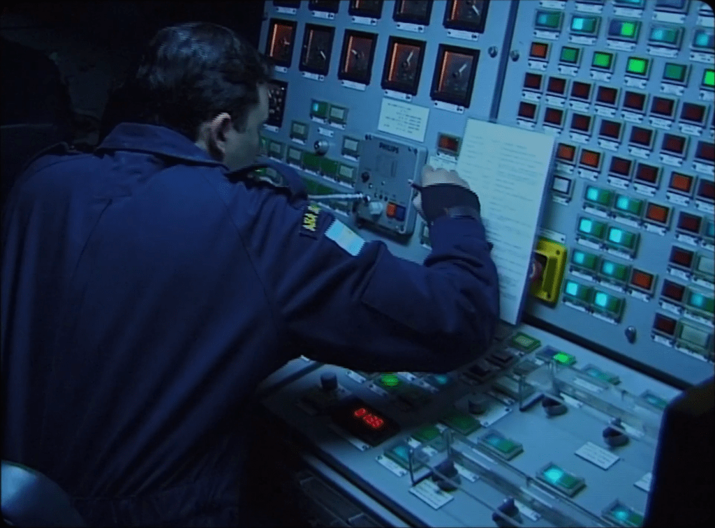 圣胡安号甫一下潜,外面的世界便消失了,地球被压扁成雷达扫描的圆形,以及各种仪器上,或数字或编码的所指,而电影人立刻便意识到了,自己不属于这里。在圣胡安号中,堪称上镜的东西寥寥无几:被困在潜艇狭窄的过道中,被挤在一颗颗鱼雷之间,看着船员们做着复杂的技术工作,以及他们平平无奇的消遣活动:抽烟、吃简单的食物、下棋、听几首平克·弗洛伊德的歌变成了两方人唯一的共鸣——或许也是旅程中唯一不是杂音的东西…… 唯独缺少的,就是梦想中凡尔纳式的小说情节:海上间谍活动;不可见人的军事机密;鱼雷激动人心的发射;或者一场与伟大海洋的搏斗。即便是拍摄无聊,都无法以安东尼奥尼的方式将人的轮廓镌刻在现代建筑的阴影下——他没有这个空间,因为这个空间早已为他划定了景别。船员们就这些外来人偷偷地交头接耳(他们给莫吉兰斯基取的绰号是“布拉德·皮特”),也并不会过多看向摄影机,不像某些人种志纪录片或“现实主义”作品中的陌生人,总是无意中看向镜头,用他们的双眼不断提醒电影人——“你在看着我。” 但在圣胡安号上,船员们有自己所统治(和被统治)的机器,他们并不在乎这三个业余导演能拍到什么——在这里,电影是隐形的,无用的。