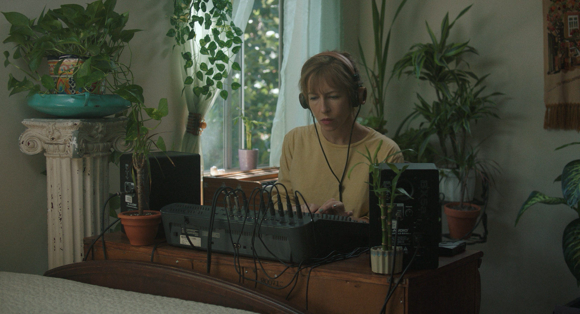 Conversations on musical history, often improvised, live performances of experimental music, vintage audio devices, there is a secret society to discover. Meanwhile, landscape study persists parallel to the intricate sound world; the physical earth on which our heroine travels becomes mystified. Always sensitive to the space, this serpentine terrain sculpted by sunlight and vegetation, Davies maintains its curls as the heroine makes her journey, tracing the origin of the tapes, each time passing through her fellow guardians of sound, music, even noises – NPCs or little angels if you will. (Davies named his biggest influence on the film “90s point-and-click adventure games” on PC.)