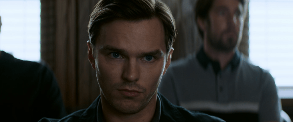 因此,这句“你很完美”成为了一条戒律,而对于我们并不完美的主角来说,维持完美的当下成为了必须去完成的行动,无论是布置一间屋子,还是在法院内成为道德与理性的代表,唯有如此,他才能洗刷来自过去的罪恶。在尼古拉斯·霍尔特的形象中,伊斯特伍德找到了一个坚定地令自己变得无暇的人物。尽管这位演员早已褪下了《疯狂的麦克斯4》中苍白的铬金化妆,还原了纯真的面容,在这里他仍旧无法逃脱最揪心的洗礼,身后被窗户画出的两束阳光,令背光的面孔成为了自身的暗面,如同一双紧闭的眼睛死死盯着摄影机。