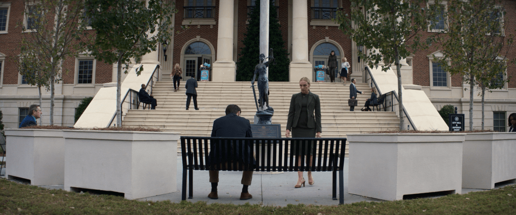 下一秒,被遮住眼睛的孕妇摘下眼罩,看到一间粉刷得整整齐齐的婴儿房,墙上贴满了可爱的小动物,窗外的阳光洒落在镜头前。这是丈夫贾斯汀(尼古拉斯·霍尔特)给艾莉森(佐伊·达奇)准备的惊喜。“它很完美”,她对丈夫说,“你很完美。” 这个温暖的房间同样构成了完整的理念,即古希腊人所说的理型,如同一个原始的承诺,尽管在人类的世界中,这个留给未来的样板间和手持宝剑的女神一样,像一种最坚定的痴人说梦——在这之后,婴儿房的空间将从大部分时间中消失,被替换为昏黄的客厅、厨房、以及被百叶窗与日光所切割的陪审室。但正如在踏入法院时,我们的主角被教导他作为陪审员的神圣职责,伊斯特伍德也为这个标准的中产家庭想象了律法般的爱:这句“你很完美”听上去就像教堂前的誓言一般,爱人必须对对方说出这句话,才能塑起夫妻这个现代神话的雕像,正如理想和现实必须如朱斯提提亚的天秤一般保持平衡。