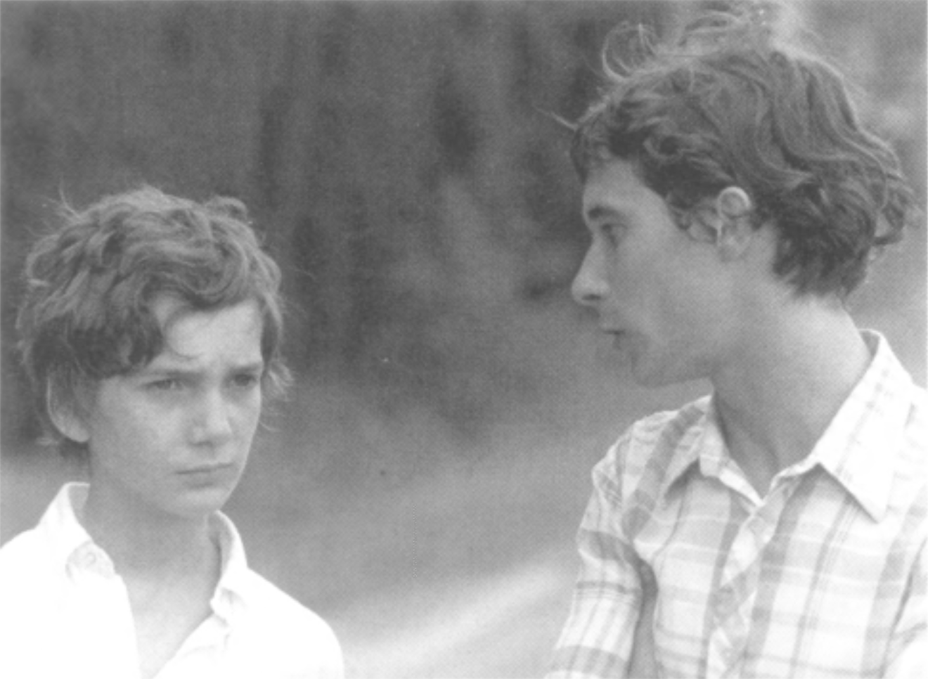 于是,来自这种换置的暴力,将神圣性跌落至人间,允许风格上的摹仿跨过原型自身,找到了一种超越致敬与忠诚的形式。创造性的细节比比皆是。例如,何西(Dionys Mascolo 饰)这个人物很长一段时间都被呈现为一位讲着蹩脚法语的西班牙工人。但是,当他张嘴说话时,听不见一丝外国口音的痕迹:如布列松,精确性要彻底地背离“普遍经验事实”4(尼采)。这一点同样适用于英格丽·卡文(Ingrid Caven),她一反常态地饰演了一位法国农村妇女,在影片上映时饱受评论诟病。抑或是,在这部从不遮掩自身自传性的影片中(一如厄斯塔什的所有作品),作者突然间插入一段从另一个人的生活中偷窃来的事件。在爬树的段落中,影片重新排演了米歇尔·莱里斯(Michel Leiris)在《成人之年》(L’Âge d’homme, 1946)一书中描述的关于“第一次勃起”的记忆。5 如同承认自身那文学的、次等的、假借的本质,性行为被一种更暴力的方法揭示,因为它允许记忆的复杂性被暗中确认(它同时是感觉、场景、场景之复现、谎言和质疑),并将不属于自己的东西强行植入到虚构的。 与此同时,在剪辑层面也有一例:丹尼尔在两个不同的机位中重复一句台词(“在我读过的一本书里……”),完全背离现实主义,既让我们联想至戈达尔,同时也能想到布列松一句格言的字面含义:“从(一个画面、一个声音的)重复中所能获取的所有效果。”6