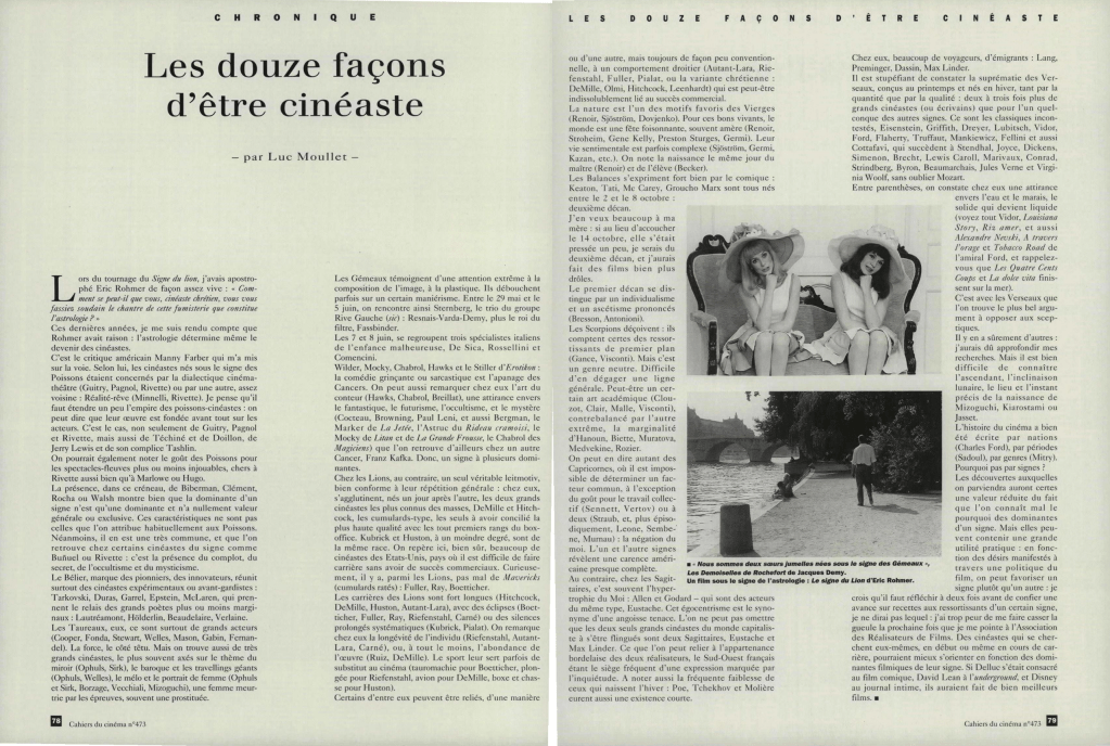 在《狮子星座》的拍摄期间,我曾呵斥埃里克·侯麦:“为什么你,一个信仰基督教的电影人,突然会为占星学这种骗术辩护?”