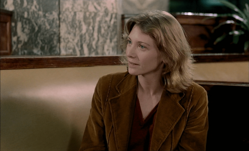 且不说时间,如果说影片的形式强度和演员的身体强度紧密相连的话,一个由演员自身的行动引发的剪辑变化,和镜头前的演员单纯被电影的剪刀所携带,在这主语的细微变化中,显然有着显著的区别。除去旅途中那些从窗外看去的风景之外,奥萝尔·克莱芒近乎出现在了电影的每一个镜头之中,这种和形式本身互为主体的力量无法被忽视,而当她的不在镜头前时,或许会构成极隐秘的阵痛,当镜头中只留下一位男子或一片景色。当她牢牢地处在画框之内,克莱芒的形象有着静止的肃穆,然而又不带有自然主义,其不变的妆容和服饰固定了其不可知的一面,令她被塑形。这点或许能和布列松媲美,尽管阿克曼显然不昭示任何基督教式的形象,然而我们仍然想到了贝内兹就布列松主义所概括的:“精确性要彻底地背离‘普遍经验事实’(尼采)”、“在重复中得到效果”、“每个动作都包含某种谜团”、“保守秘密是人物的常态”,等等。8但依旧回到奥莱芒,我们会发现这位或许是电影人银幕化身的形象,在现身的顷刻间,已然将“阿克曼”驱逐了出去,只有如此,阿克曼才能用写作将自己再度找回。克莱芒的身体,其不同的表现形式,或直接或隐藏,构成了为自己和为他人塑造形象和空间关系的无声容器。值得一提的是,在1997年,克莱芒扮演了另一位电影人的化身,在安娜-玛丽·米埃维尔(Anne-Marie Miéville)的《我们还在这里》(Nous sommes tous encore ici, 1997)中和导演的伴侣戈达尔共同出演,二人都将自己幻化为更浪漫喜剧式的形象。