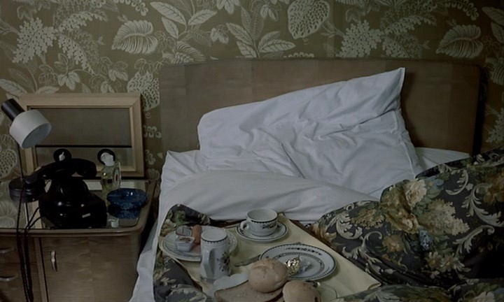 让我们简略地谈谈身体在不同情境下的具体境况,以及形式是如何被处理的。我回想起影片中的第一个性爱场景,在这之前,安娜在当晚放映完自己的电影后,和一位还没有名字的德国金发男人走进了自己下榻的酒店。接着,近乎是以过于传统的方式,我们直接看到了赤裸地相拥在房间床上的二人。阿克曼省略了从门厅到卧室的距离,人物似乎已经忘记了自己的衣服是怎么没的,棱角分明的镜头完全没有凌乱无序的布置。然而,这个场景中最重要的一句话是:“穿上衣服。” 接着,更晚些时候,当安娜将男人送出门并约定第二天见面后,阿克曼拍摄了一个漫长的镜头,其中我们看着女演员慢慢走回房间,还驻足于其它住客门前的皮鞋和剩菜。这是在片中我们第一次看到这个走廊——它只会再被拍摄一次,在第二日清晨,在另一种光线之下。但上述这个镜头的刺点也不是任何画面上的对象,对我而言,它是安娜的高跟皮鞋踏在地板上的声音,演员行走的速度提供了持续的节奏。在斯莫伍德的解读中,这种声音是德国的声音,历史的声音。