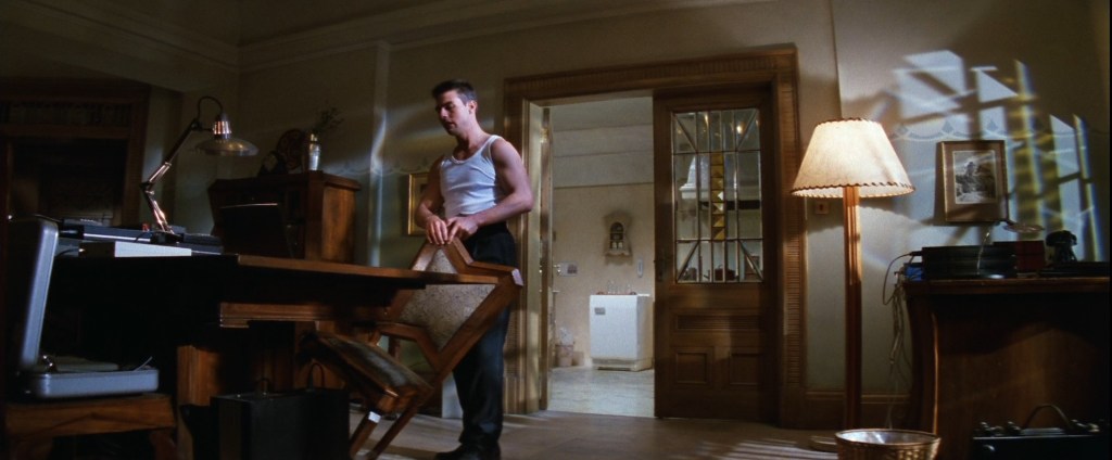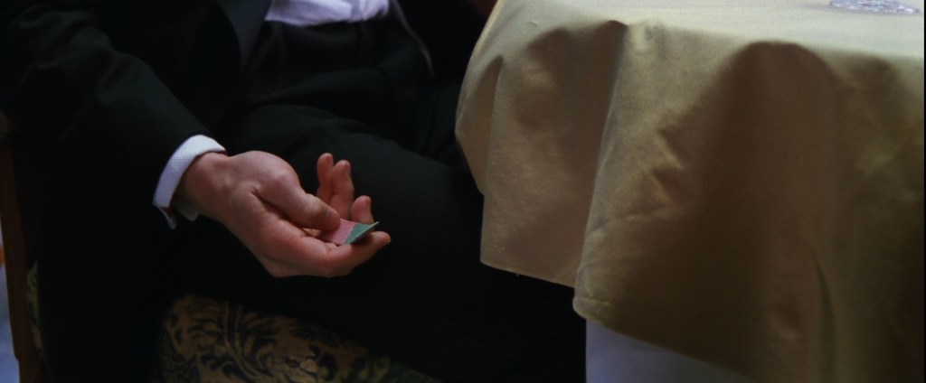 疑惑的:大衣的游戏。在大使馆的地下室等待电梯时,莎拉感到冷。她寻找一件大衣,因为没有带上自己的,于是顺手拿走附近一件黑色的。接着,在同一间洞穴般的房间里,戈利钦路过一件蓝色大衣,挂在另一把椅背上。同一个段落,稍晚的时候,吉姆·菲尔普斯在逃跑前系紧了他的大衣;很久之后,在高潮的火车戏中,电影在两个穿相似大衣走过车厢的形象之间交叉剪辑,分别是基特里奇和另一位神秘人物。在布拉格的灾难之后,伊森用自己的大衣在地上撒碎玻璃。椅子的游戏:吉姆踢倒的椅子,将是伊森在稍后会扶正的,当他在自己的队友被屠杀后回到公寓;他取代了吉姆,令其被免职。在开场字幕前的段落中,带着伪装的伊森已然扶正了一把椅子(电影的第一个镜头),并踢倒另一把。房间的游戏:所有秘密的,“行动”的空间,在电影中都很相似——一些暗室,除了灰尘和电脑以外空无一物。坚持玩这些游戏的意义是?什么也没有,除了不断强化“配件”元素的角色。2