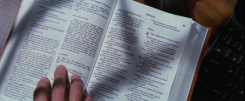 哇哦!:我们不敢细想《碟中谍》从《圣经》中取材了多少内容。不可否认的证据是吉姆·菲尔普斯的内疚,它为这一虚构所上的瓷釉,透过如鞭炮般连环炸开的线索。首先是文本(但麦克斯强调“约伯” [Job] 并不会引用圣经典故),接着作为容器(在伦敦的公寓里掉到地上,一旁则是老旧、未拆的信件),最后终于作为一本书出现(内封被“该死的基甸会人”5印上了“芝加哥德雷克大酒店”字样:但吉姆未尝没有把这本《圣经》拿走的权利呢?这个情节几乎来自某些心怀叵测的守夜人的妄想)。作为永恒的神旨和无意义的符码,这本书像油灰般堵上了虚构中的孔洞,拜其远古的权威所赐。当决心已定的伊森坐在电脑前,一手持着左轮手枪,另一手捧着《圣经》,我们此时便不再怀疑:他定会从此事中脱身,他已经有了正确的器具,只需再嚼一枚口香糖安定身心即可。所以说,《圣经》是亨特先生的终极武器吗?