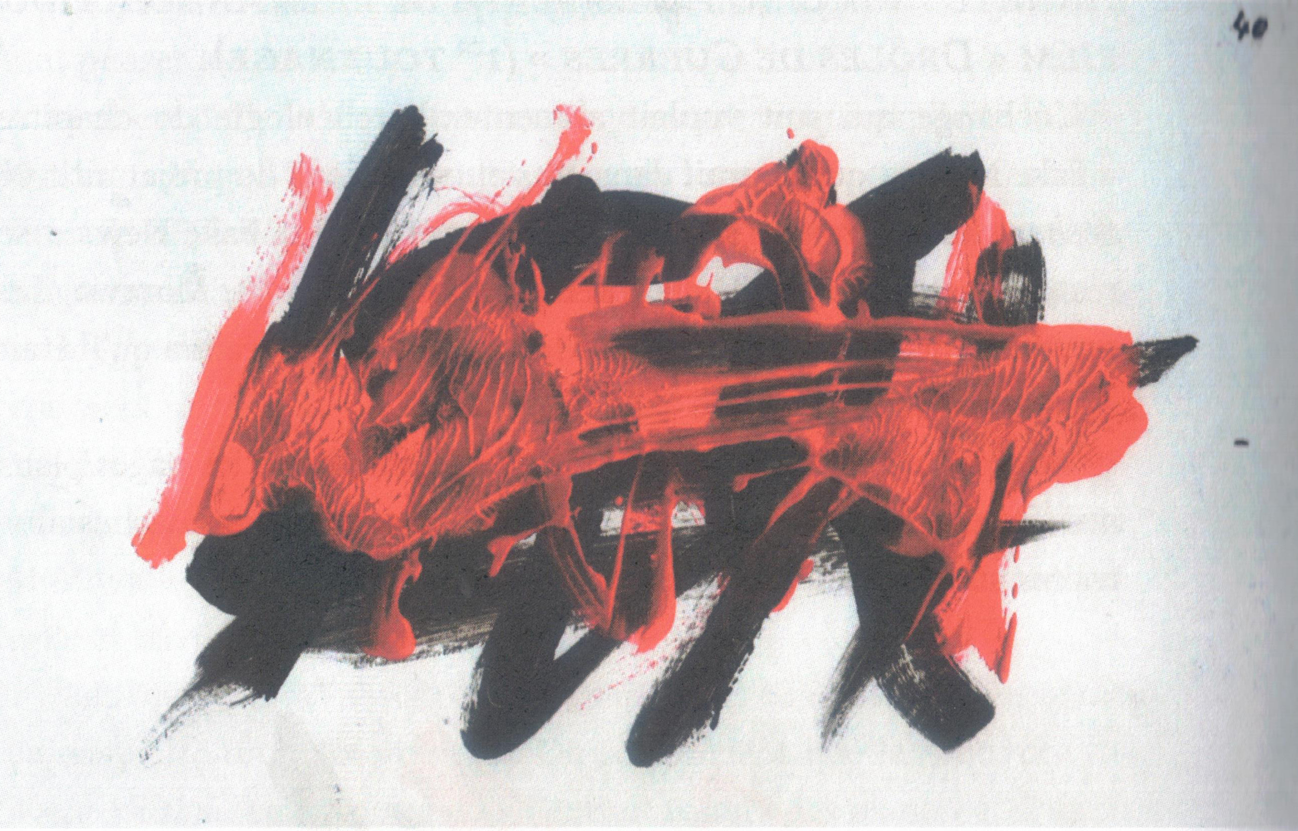 然而,从一个项目到另一个,这些书信在《〈假战〉预告片》的第1和40号页面/镜头中得到了回响:那是两幅将红色涂抹在黑色上的抽象水粉画。