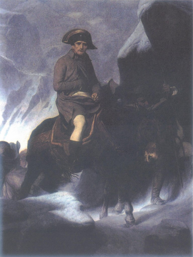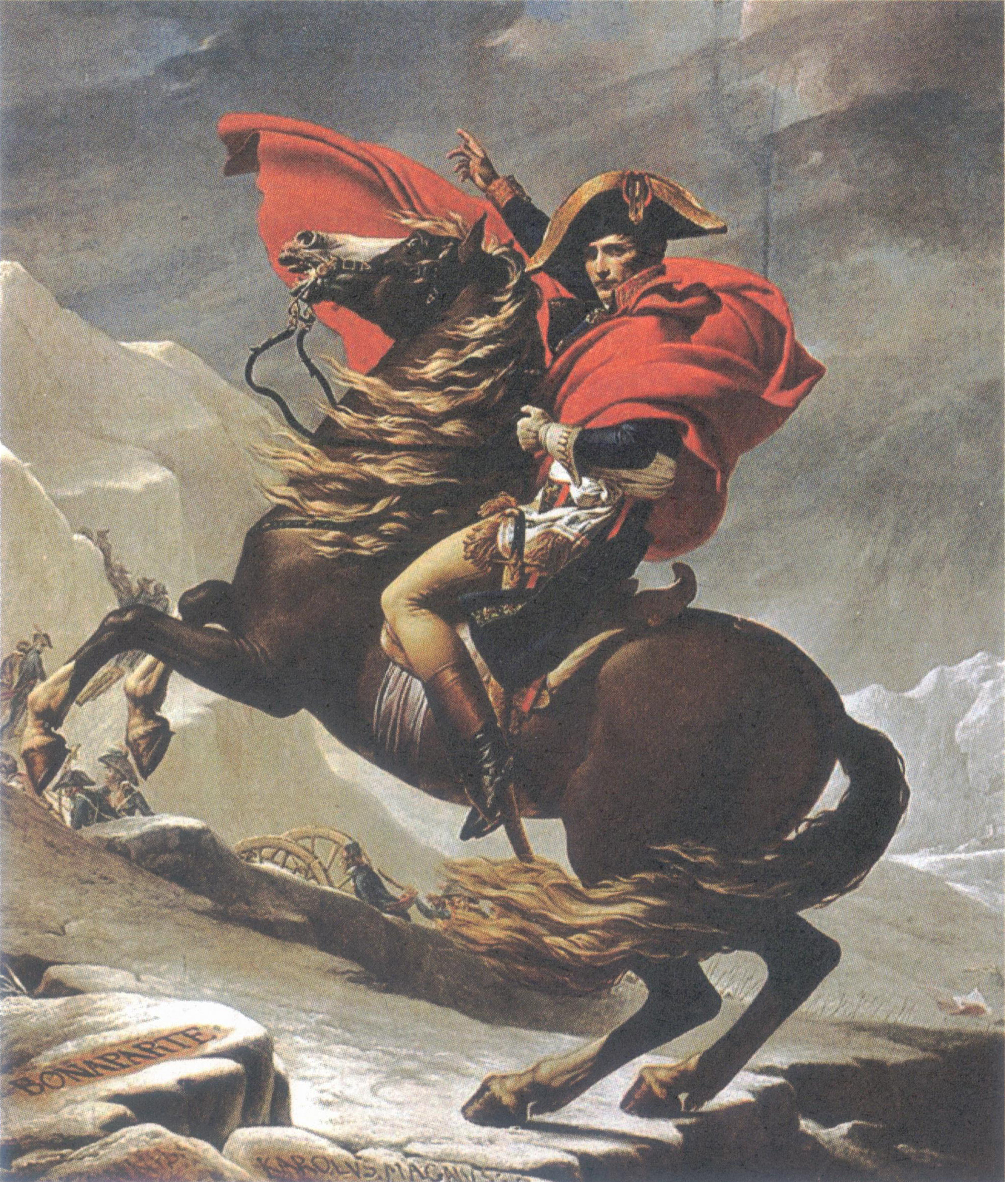 第一执政官于二十日的日出前出发。他骑着骡子攀上圣伯纳德山,身披他一贯所穿的灰色斗篷,由一位当地向导引路。在险阻的路途中,他表现得心不在焉,仿佛思绪飘往别处。