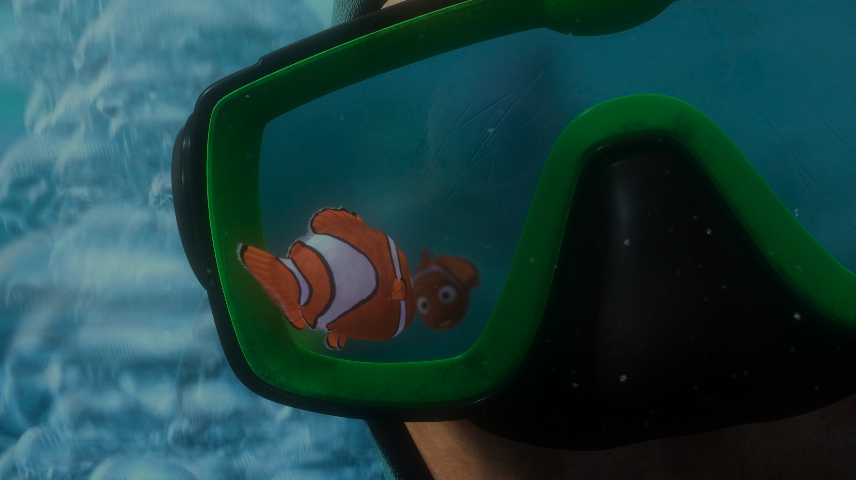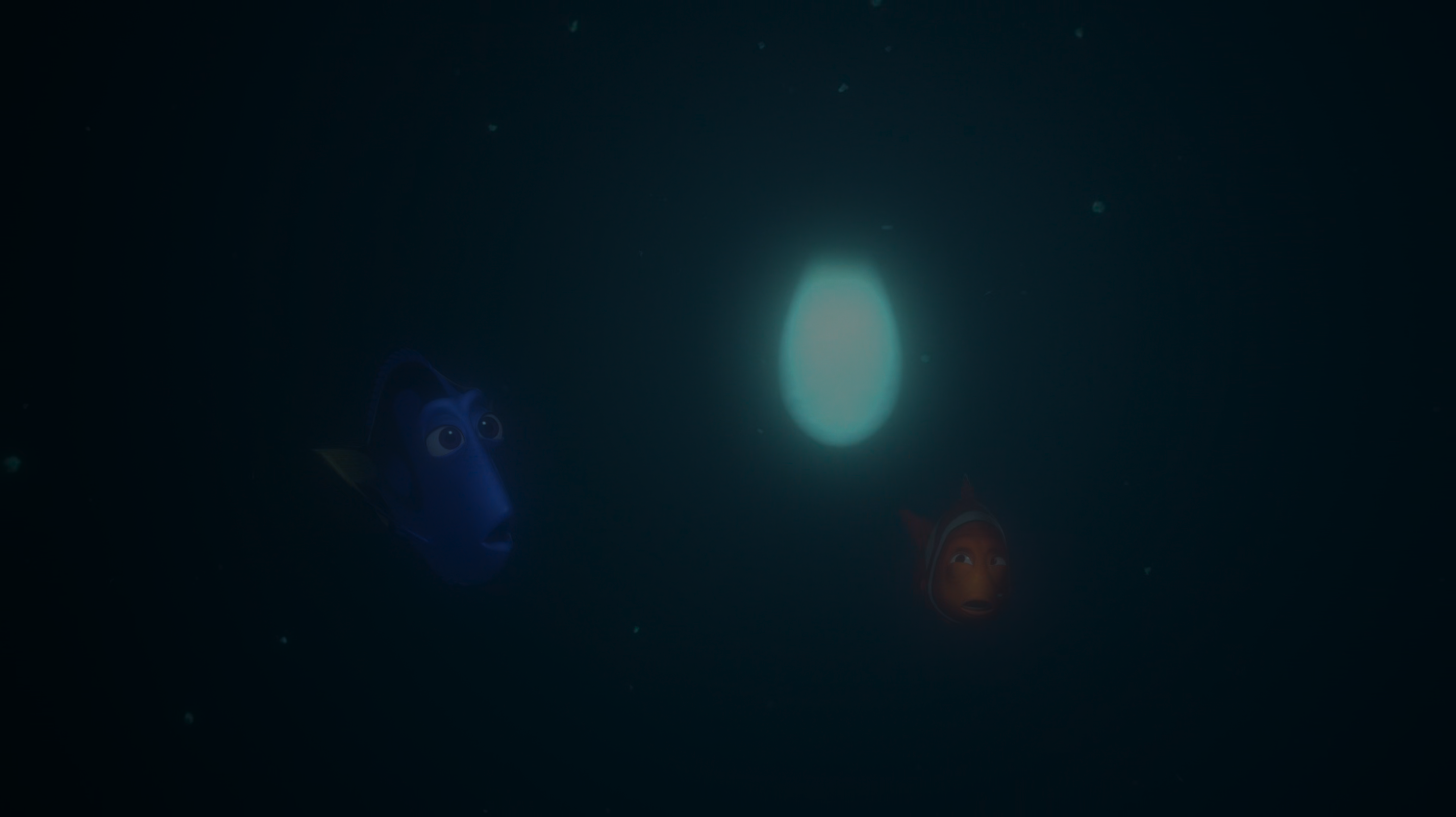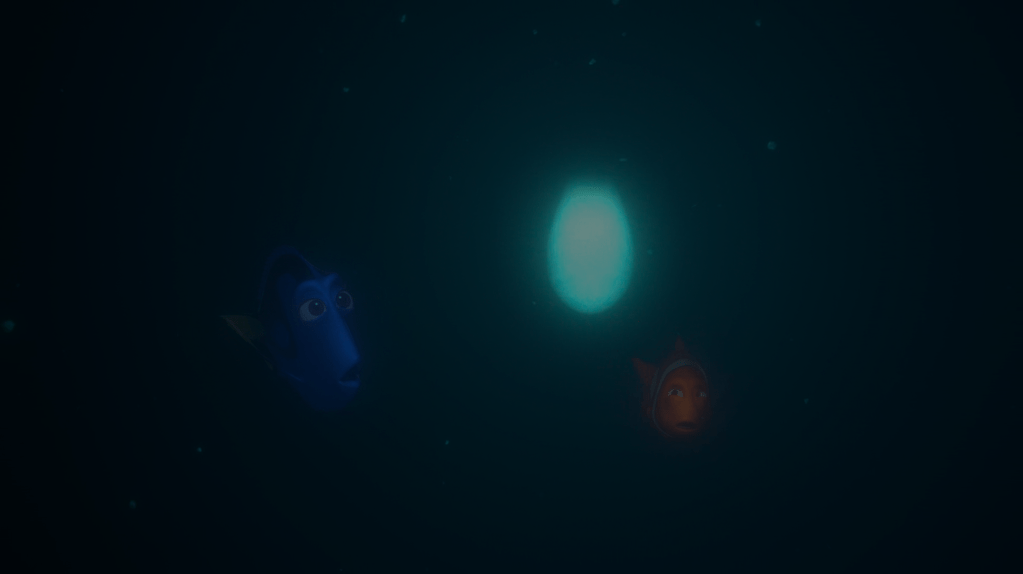 在无形的水中,多莉是一位不规则的舞蹈家,会创造出多余的冒险,或加速故事的线性。和很多确保孩子或家长“不会跑出视线区域”的儿童电影相反,《海底总动员》最迷人的时刻,是一片黑暗。透视消失了,看不见马林的多莉给了对方一个新角色:“你是我的良知吗?” 于是,它们带着缥缈的快乐,游弋于死亡的领地并追逐它白色的小光点:在父母们紧张的头脑里,身体下沉到一大片黑色中,将被视作“死亡”,又躲过鮟鱇鱼的追杀,逃出此地。是的,皮克斯的角色虽然向观众保证了自身的不灭,但它们总是会超越警告,在庞然大物的跟前转圈,或者误入黑魔法——海渊、水母群、乃至一场即兴的勇气,它们都会导致目光的断裂。