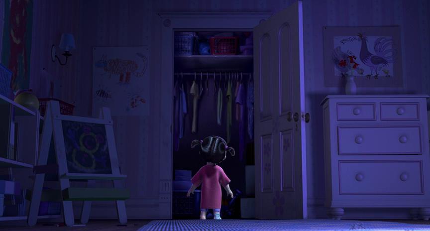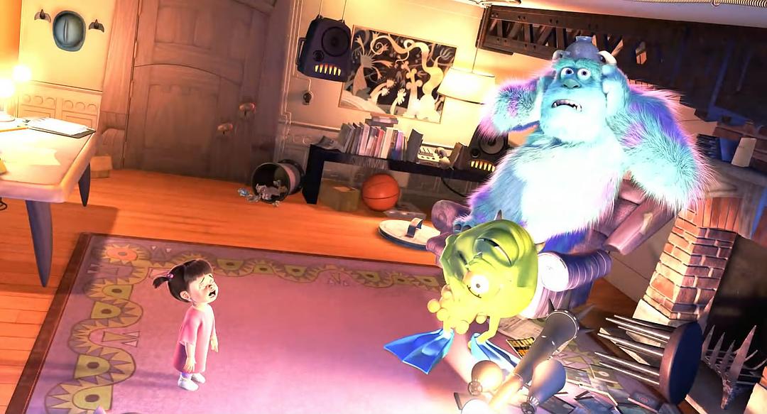 《怪兽电力公司》的疯狂在于它不仅创造了一个自给自足的政治和经济体系,也不断书写着各种即兴式的大小形象,一些“只是怪物”的存在。这些外表并无任何所指,不追求效率或效果,它们只会突然闯入来呈现差异,或是从速度和调性上改变影片的节奏,为此兰迪·纽曼的爵士配乐成为了电影的灵魂。当大眼仔伴随着音乐准备开始一天的工作,随着镜头逐个为观众展示一项工作的准备工程,一个孩子第一次遇见了电影和现实。皮克斯继承了经典好莱坞的传统,去拍摄工作中的人物的琐碎流程,它对一项职业的乐感保持痴迷——身形修长、天生迅捷的反派兰道,被“毛怪—大眼仔”团队一大一小的组合速度击败。“怪兽公司”的大楼尽管是积累资本的恐怖之地,却意外满足了我们游荡探索的梦想,它比我们认知中的更加庞大,无论是公司明面上的工位,还是老板实施绑架的“管道间”,都只是待探索的一角。真正的脏腑是隐藏在内部的巨大“门廊”,既是个密闭空间,也是连接着无限世界与深渊的大型枢纽(《玩具2》结尾在机场行李传送带上的冒险,无疑是其现实草图)。“门”是皮克斯作品中最出彩的概念,它恰如其分地成为了剪辑自身,那令人眩晕的通道系统集结了所有的速度。