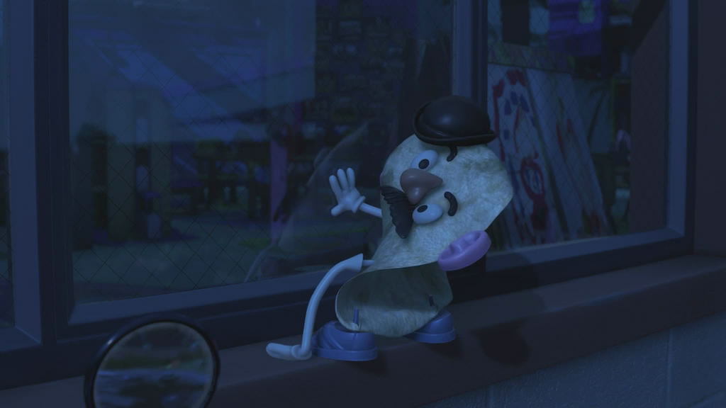 再次赞美《海底总动员》,它先于那些“写实主义之作”,探讨出了应对创伤的方法,从一位父亲的恐惧,到集体鱼类对船只的恐惧,给出的启发却很简单:去学习交朋友。以此为例,我们会发现早期皮克斯的故事,总是以朋友为单元,朋友不只是共鸣的载体,更是与自己截然相反的存在,重要的是相伴,而非全然的了解。真实是个摸不着边的混沌体,但朋友组成了一个单位,也是家的深层形态。有一个普遍的认知可以证明《玩具总动员》与我们的友谊形式,即所有的形象都是演员,“草莓熊”只是上演了一出复仇故事,巴斯光年只是被切出了一个西班牙浪子的版本,伍迪则放不下他扮演了许久的英雄。一位演员是可持续的,ta在电影的故事开始之前已然存在,却为了团体给自己化妆,一次次走进类型,绝不可能被用完即弃。《玩具总动员3》或许第一次让皮克斯意识到了童年的逝去,但它不仅给予观众这些人物在面临死亡时奇迹还生的时刻,还有另一种“不死”的思想:“土豆先生”与“土豆太太”是这群朋友中最杰出的性格演员,他们的五官被无数次拆出,被错放在不可能的身躯中,被打散成作为个体的零部件,却依旧是他们本身——当“土豆先生”被安置在一片玉米饼上(“看,我是毕加索!”),他的特技超越虚拟的肉身,透过彻底的形式达到顶峰。