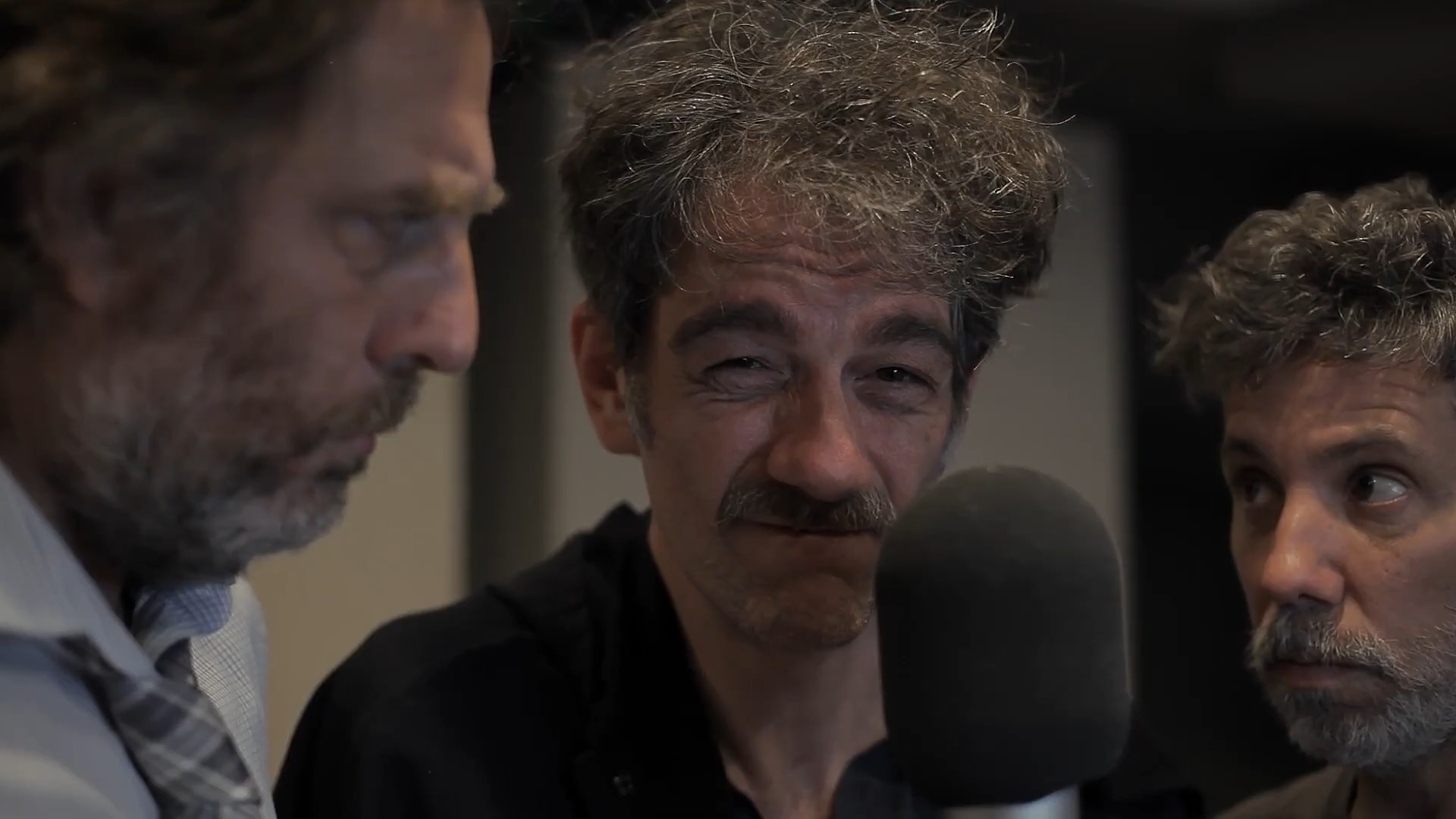 “布宜诺斯艾利斯人总是将探戈与文字联系在一起”,林克与温德兰在《追寻探戈者:阿根廷探戈器乐史》中写道。7 正如音乐家们的重新诠释,电影人之间的对话则成为影片的第二声部。潘佩罗小组最美妙的关切——影像、文字与声音的聚合——映照了布隆伯格作品的诗学,也映照了科西尼的旧唱片与达卡尔的现场演唱之间的呼应。同时,利纳斯电影中的口述传统,也从前作更为孤立的独白体中延展出来,发展为关于对话、问答和辩论的表演(这点在《花》第四集中就已经有所探索)。这一形式不但再次令电影与广播相遇,也近似于短小的滑稽剧(sainete)——一种源自布宜诺斯艾利斯剧场的喜剧小品:利纳斯、门迪拉哈苏与达卡尔三人围着一支麦克风辩论,他们的争辩因此成为影片的节奏,既是当下的思考,也是其余思,将影片置于拍摄与剪辑的双重时间之中。