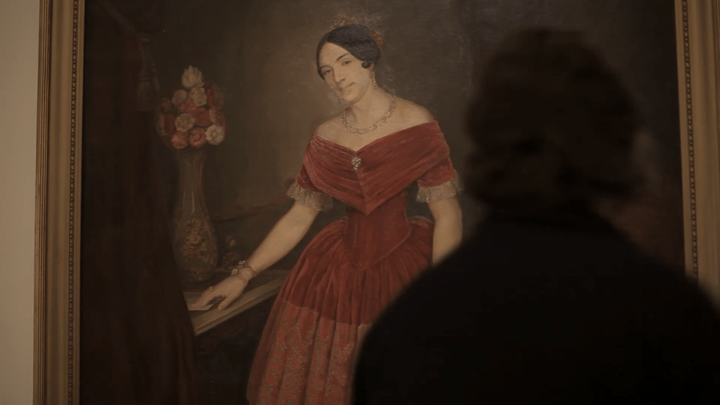通过与布隆伯格歌词中充满历史鲜血的叙事形成对照,这些对话令影片保持了幽默的能量。冒着碎碎念的风险,无论是争论罗萨斯是否是一位暴君,还是讨论政治谋杀与对女性的谋杀(femicide)的区别,都让过去的历史在当下被重新打开。最终,利纳斯自诩的“政治中立”——一个近乎自我恶搞的笑料——似乎证明了相反的事实。但所谓的“立场”无非是打开叙事的发酵物,邀请观众重新思考歌曲中的语言。最终,作者既不与罗萨斯同盟,也不站在其反对者一边,其立场只属于歌曲的作者,这些有些天真的浪漫主义者,为此他将自己变成一位像布隆贝格似的说书人,用旋律包裹神话,带来叙述的快乐。在这些十九世纪的原型中,利纳斯看到的是民间故事在流传中带来的历史模糊性——口口相传的历史在不断复述中改变了叙事,让奥戈尔曼这样的真实人物,在“无名的绣花女”、“酒馆老板娘”等幻想人物身上生出新面貌。为了生存,奥戈尔曼选择隐匿身份,拒绝成为纪念碑,却也最终成为了歌曲里的传说,化身为“圣尼古拉的女吉他手”。那些有名或无名之人的画像,总能将目光投回到观众身上,而利纳斯一行则在各种艺术形式中找到神话创作的历史:为此,旧衣服将被穿上,用来绘制一系列的电影素描。