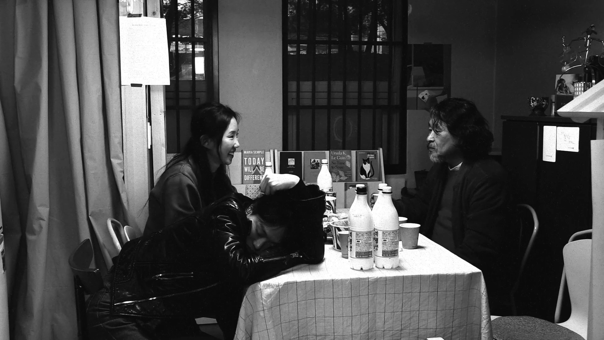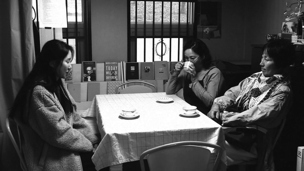 洪常秀为他的表演者创造了一个尽可能真空的世界——真空这个说法未必最准确,因为这并非说世界是空无的,而只是为了更加凸显一个情境那可贵的脆弱,因此我们无法看到角色所见的一切,当她们走出一扇门、或看向窗外时,看似只能与那最纯的白日打照面(同时可以留意口罩的出现和消失),尽管台词明确地让我看到,她们依旧在不断地评价周遭的世界,比如从高塔上远眺一片公园,这也是为何在镜头剪接到李慧英的主观视角时,突然被“看到”的真正风景显现了其平凡的,来自视线的力量。因此,画面远端完全过曝。因为远处正在不断的消失之中,真实无法被触碰,窗外的世界像粗糙布景的素描一样,被简化为只有它们极细的轮廓。我们被吊在一条浅浅的线上,为了一种证明,即这部电影只有在这几位演员微弱的对话中才能存在,除此之外我们抓不住任何东西,而哪怕是这些对话总是在瓦解的边缘。